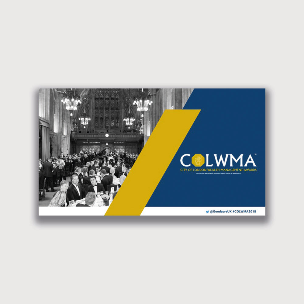 Presentation design for the City of London Wealth Management Awards, a prestigious event which recognises the quality of services from wealth management individuals and companies, hosted by Goodacre. This year's guest speaker was Lisa Snowdon. I was asked to design two presentations. One with photographs from last year's event which scrolled on large screens around the venue, the Guild Hall, London, as the guests arrived. I also designed a second presentation used as the main focus during the actual awards ceremony which announced the winners.
