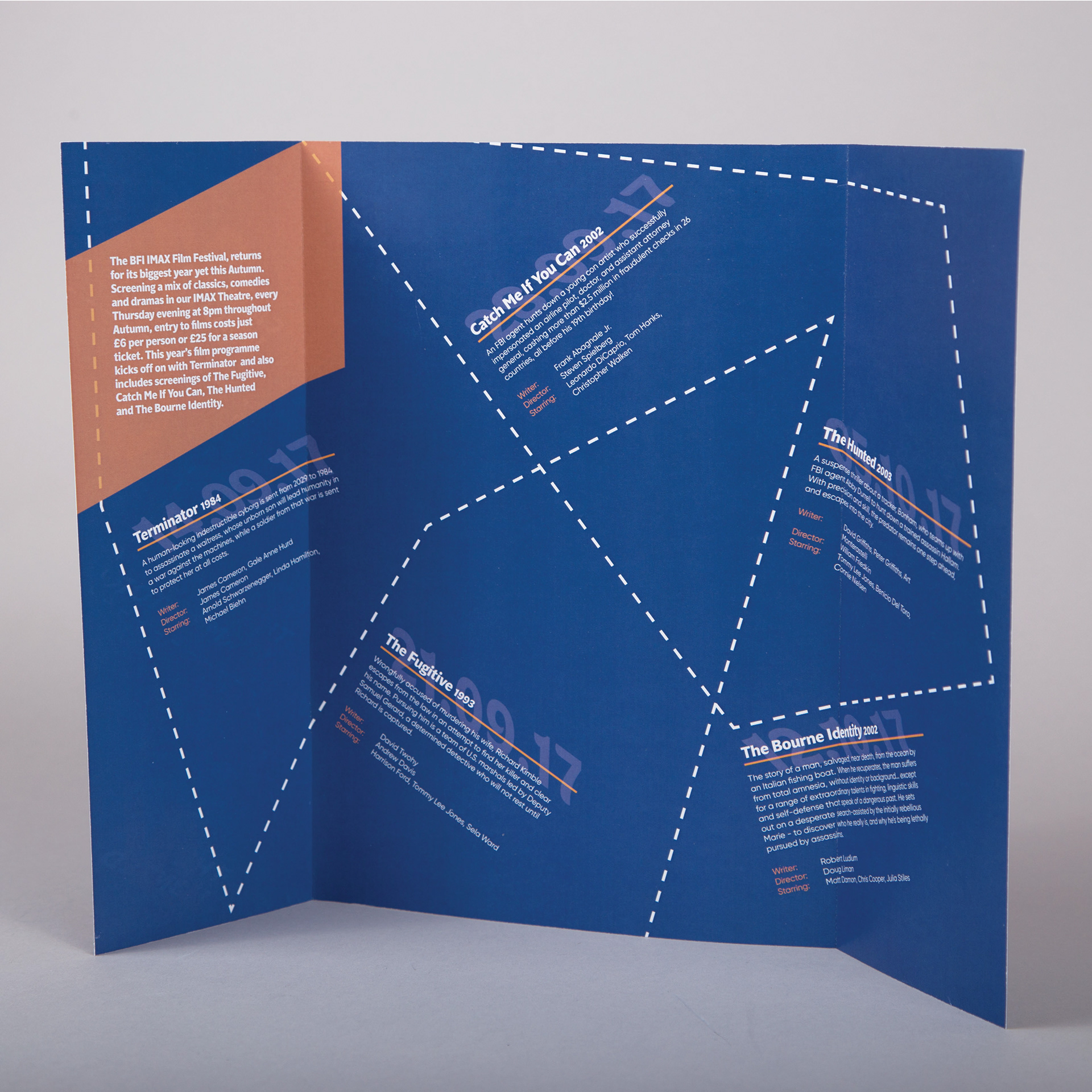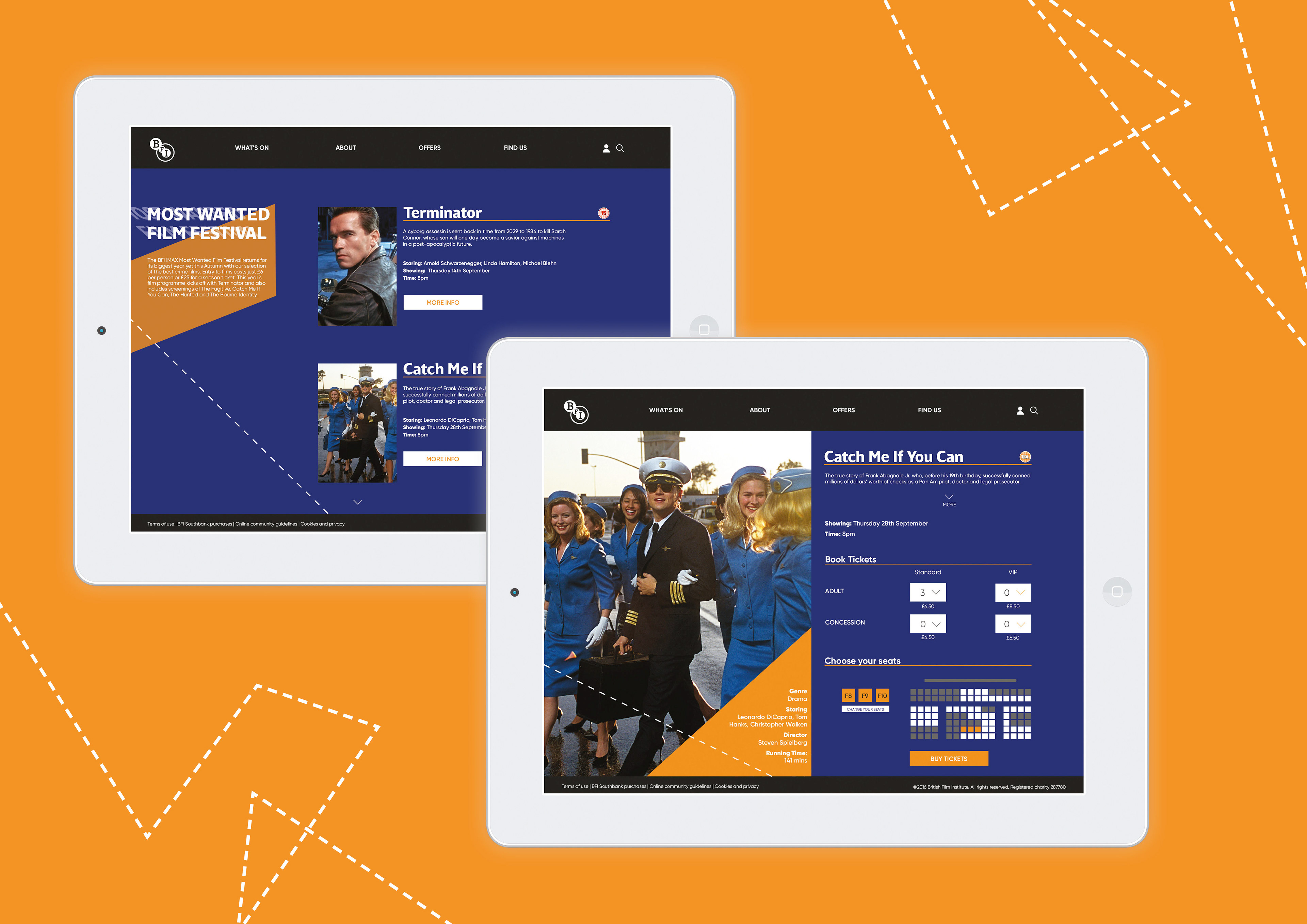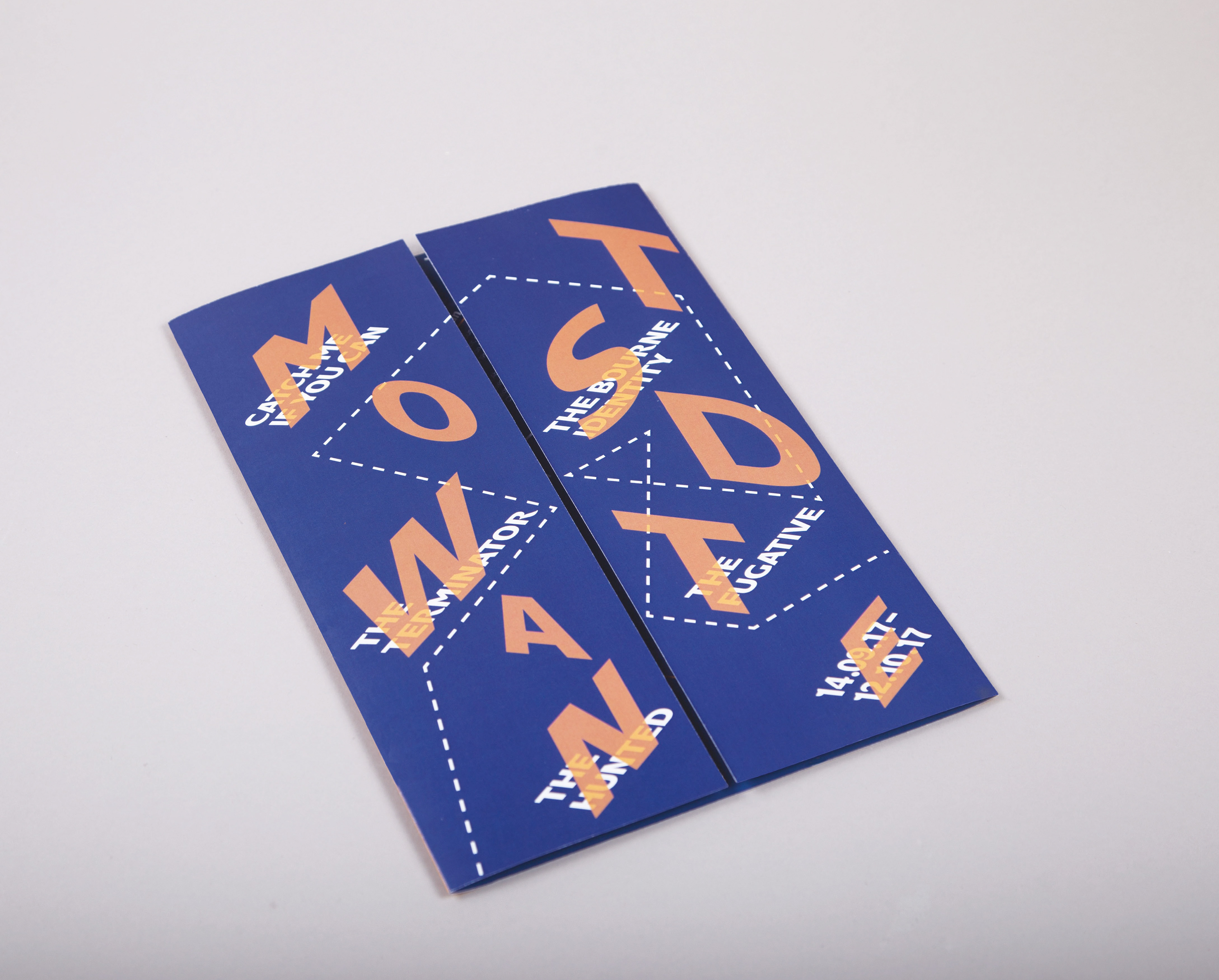 British Film Institute's 'Most Wanted' film festival branding. The concept behind the film festival is the idea of hiding, dodging and chasing, which runs throughout each of the films in the festival. The film titles on the front of the leaflet are partly hidden behind the letters of the title and graphic elements leave a trail across the leaflet. These concepts represent the journey of the protagonists in the films. A ticket reservation website and packaging for ice cream were also designed for the festival.
