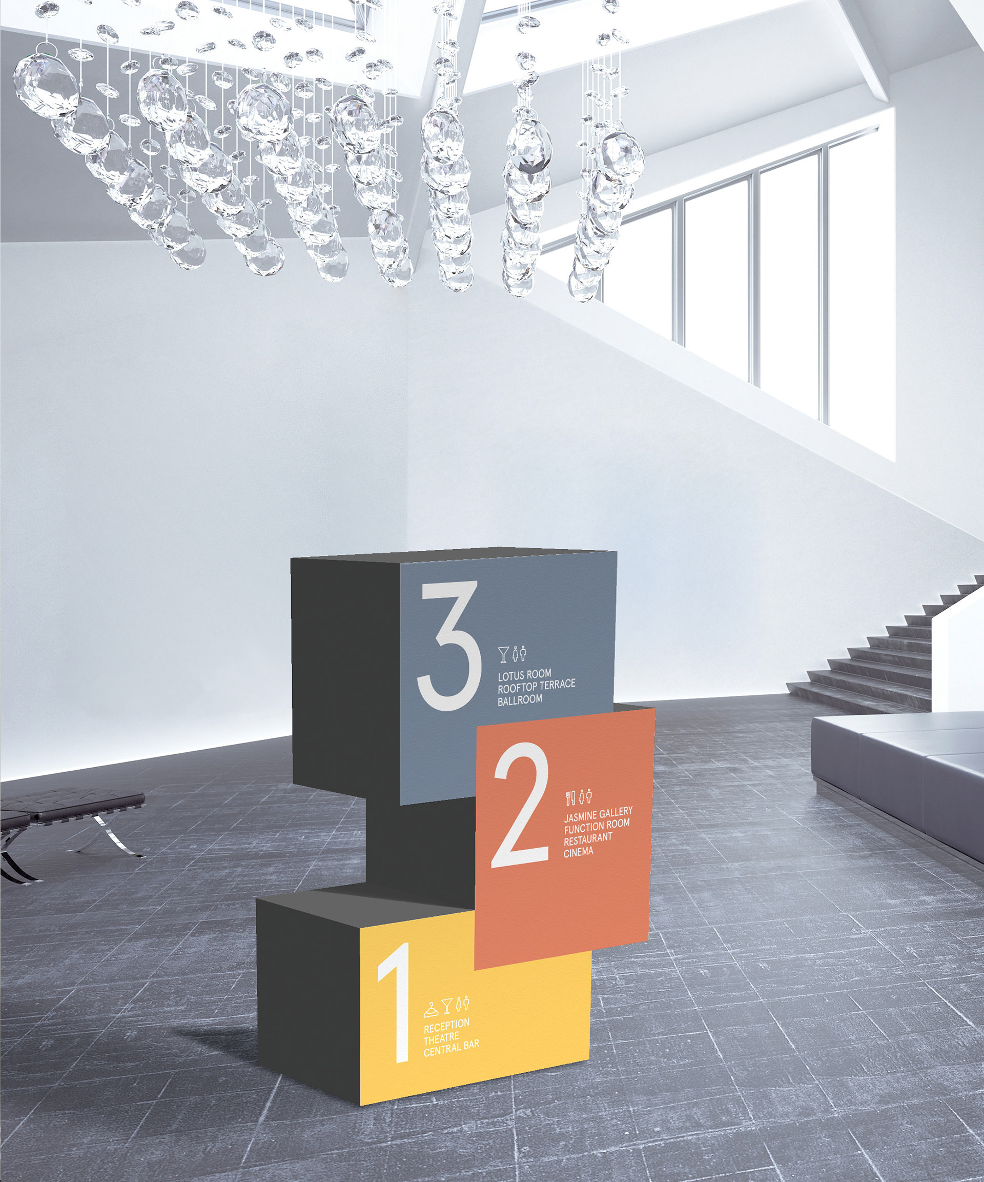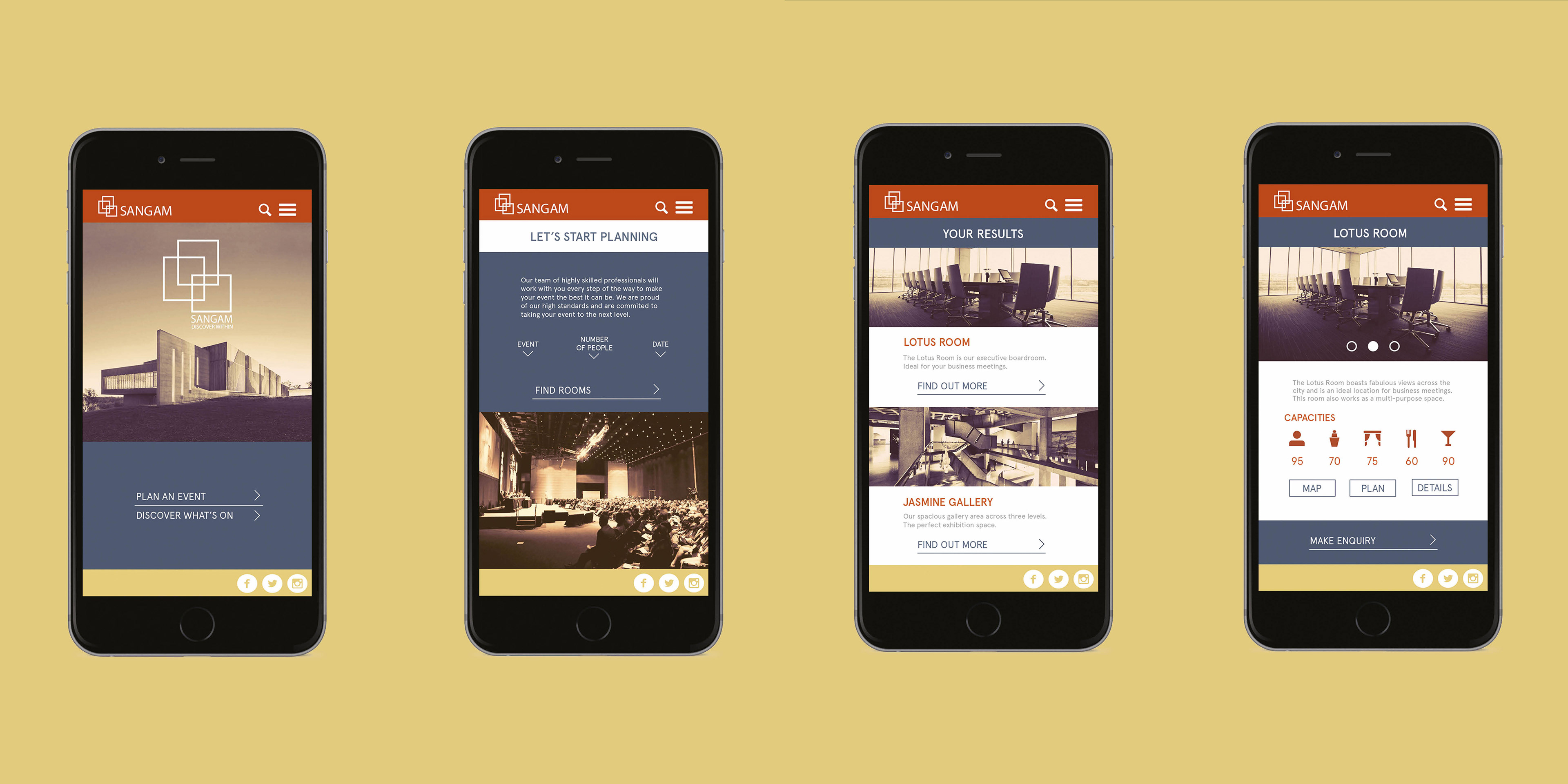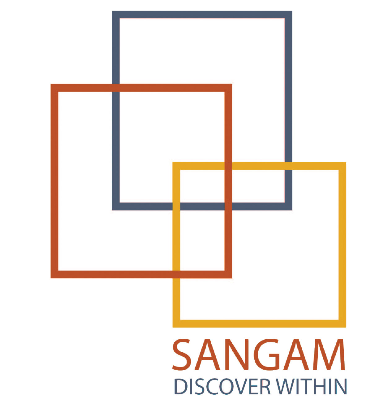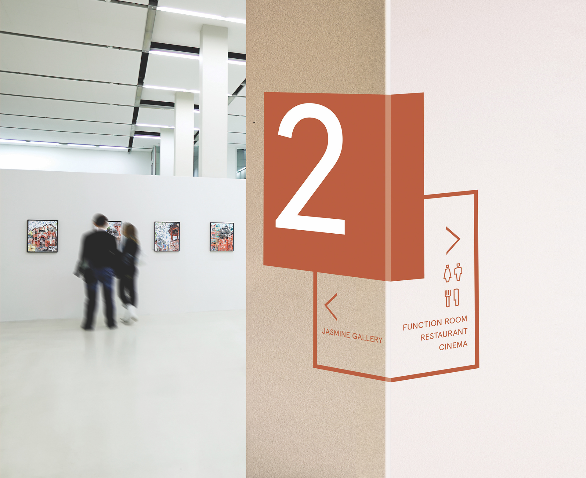 'Sangam' is the name of a new exhibition and conference centre based in Madurai, India. The city is built around the Meenakshi Amman Temple and the streets around the temple that lead out to the rest of the city are laid out in a concentric square grid system. The logo for Sangam reflects the layout of the city's streets. This concept of concentric squares is also the idea behind the wayfinders used throughout the building. The colour palette used throughout reflects the colours of the the city's buildings and street surfaces.